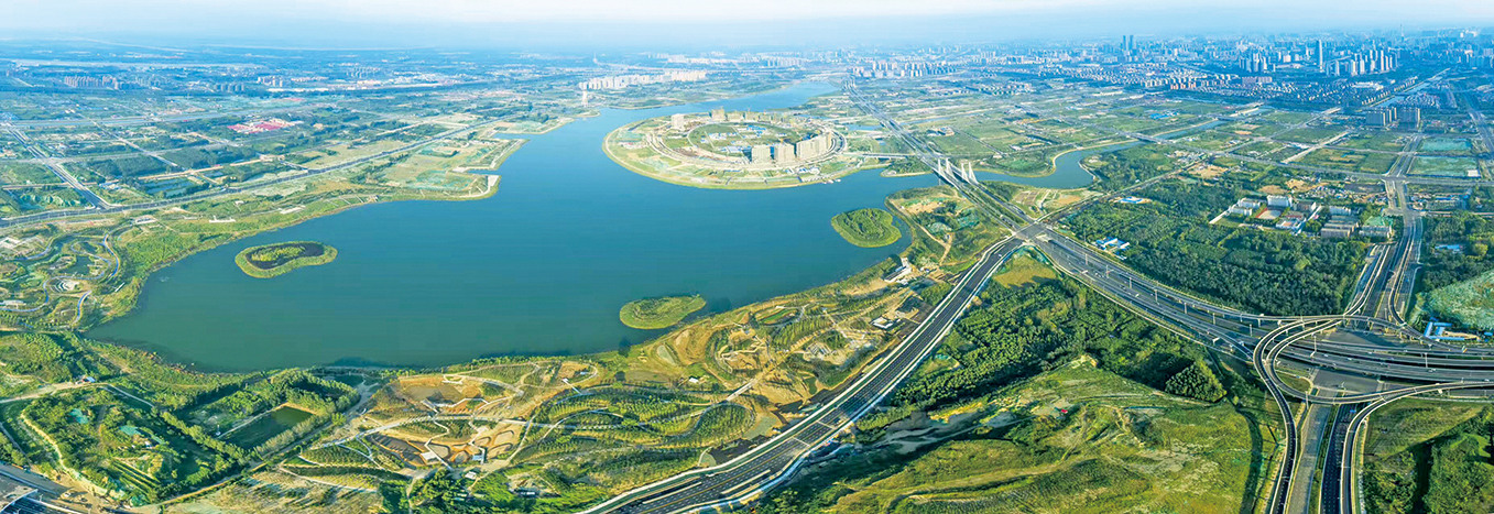 工程位于鄭東新區(qū),湖面水域?qū)⑴c流經(jīng)老城區(qū)的金水河、熊兒河、賈魯河、東風(fēng)渠和人工運(yùn)河連為一體,構(gòu)成完整的城市生態(tài)水系景觀。工程主要由水源及引水工程、龍湖調(diào)蓄池工程和灌區(qū)工程等組成。工程建成后,水域面積約5.6萬Km2,總庫容2680萬m3,具有調(diào)蓄、灌溉、景觀、氣候調(diào)節(jié)等多種功能,充分體現(xiàn)了鄭東新區(qū)“生態(tài)城市”、“共生城市”的綠色城市可持續(xù)發(fā)展理念。