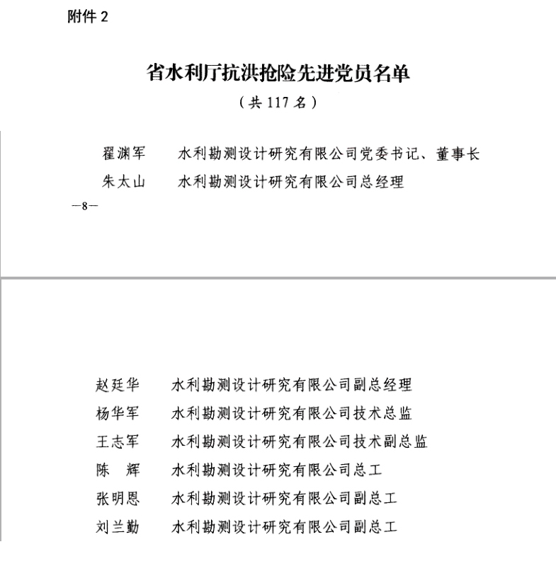 8月9日,省水利廳黨組以豫水組【2021】60號(hào)文下發(fā)了《關(guān)于對(duì)在抗洪搶險(xiǎn)中表現(xiàn)突出的先進(jìn)基層黨組織和黨員進(jìn)行表彰的決定》,公司黨委作為省水利廳抗洪搶險(xiǎn)先進(jìn)基層黨組織,翟淵軍、朱太山、趙廷華、楊華軍、王志軍、陳輝、張明恩、劉蘭勤等8名黨員同志作為省水利廳抗洪搶險(xiǎn)先進(jìn)黨員受到通報(bào)表?yè)P(yáng)。