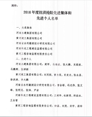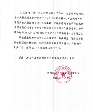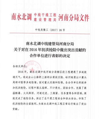 3月15日,南水北調(diào)中線干線工程建設(shè)管理局河南分局對(duì)在2016年抗洪搶險(xiǎn)中做出突出貢獻(xiàn)的合作單位進(jìn)行了表彰。我公司榮獲“2016年度抗洪搶險(xiǎn)先進(jìn)集體”稱號(hào),曹會(huì)彬、馮光偉等6位同志獲得“2016年度抗洪搶險(xiǎn)先進(jìn)個(gè)人”稱號(hào)。表彰文件如下: