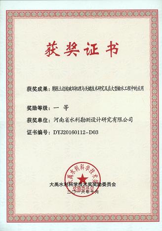 我公司在承擔(dān)南水北調(diào)中線工程的工程設(shè)計任務(wù)同時,與長江科學(xué)院、南水北調(diào)中線建設(shè)管理局共同承擔(dān)了《南水北調(diào)中線膨脹巖渠坡處理技術(shù)》等相關(guān)的國家“十一五”、“十二五”科技支撐計劃課題。在2016年度大禹水利科學(xué)進(jìn)步獎的評選中,《膨脹土邊坡破壞機(jī)理與關(guān)鍵技術(shù)研究及在大型輸水工程中的應(yīng)用》科研成果榮獲一等獎,是公司目前所獲最高級別的獎勵。