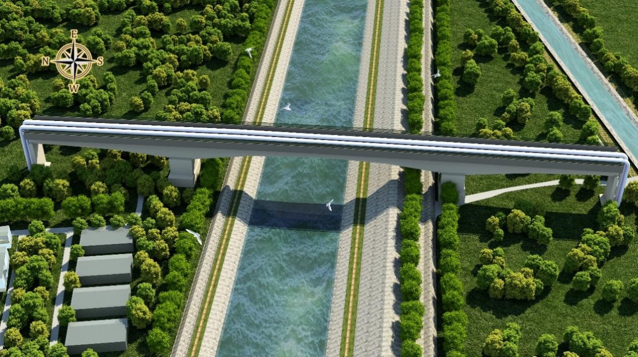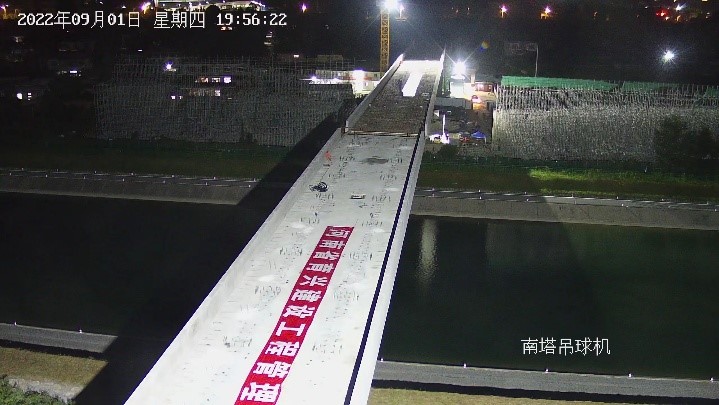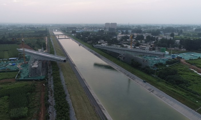 2022年8月31日下午,引熱入安長輸供熱管網(wǎng)工程跨越南水北調(diào)中線總干渠管道橋,在四套同步、自動連續(xù)系統(tǒng)牽引下,歷經(jīng)90分鐘精密施工,完成高空轉(zhuǎn)體90°,實(shí)現(xiàn)了兩座單重8000噸、單長64米的跨渠管道橋在南水北調(diào)總干渠上空的精準(zhǔn)對接。
