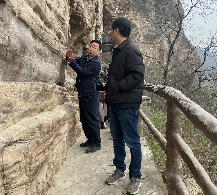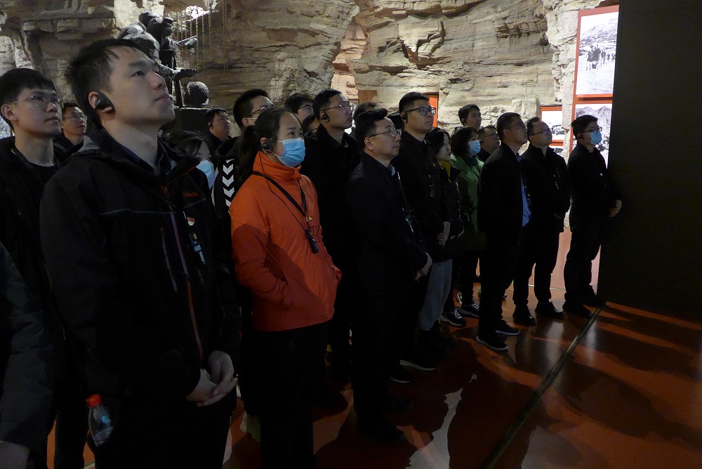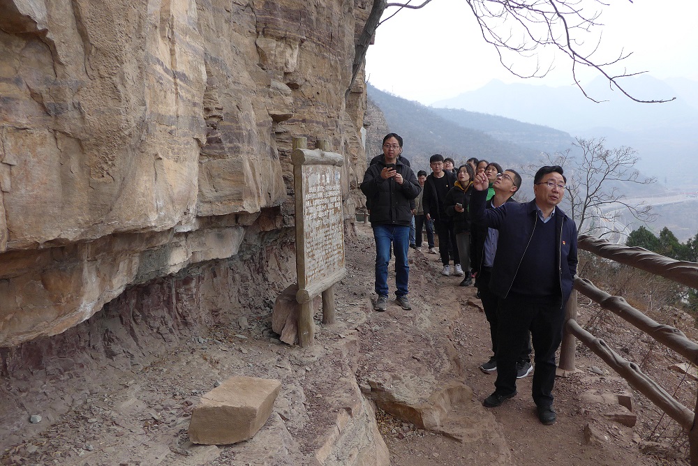 在青年洞,大家沿著“創(chuàng)業(yè)路”拾級而上,追憶著半個多世紀(jì)前先輩們在此奮斗的足跡:在紅旗渠修建過程中,300名青年組成突擊隊(duì),經(jīng)過1年5個月的奮戰(zhàn),將地勢險要、石質(zhì)堅(jiān)硬的巖壁鑿?fù)ǎ@個輸水隧洞被命名為青年洞。青年洞現(xiàn)場,面對鮮艷的五星紅旗,全體黨員舉起右拳,在支部書記楊華軍的帶領(lǐng)下,重溫入黨誓詞,堅(jiān)定了我們緊跟總書記的步伐,奮進(jìn)新征程的信念和決心。