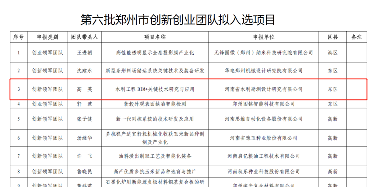 近日,根據(jù)鄭州市科技局“第六批鄭州市創(chuàng)新創(chuàng)業(yè)團(tuán)隊項目擬入選項目公示”,我公司副總經(jīng)理高英帶領(lǐng)團(tuán)隊開展的“水利工程BIM+關(guān)鍵技術(shù)研究與應(yīng)用”入選2023年第六批鄭州市“創(chuàng)新領(lǐng)軍團(tuán)隊項目”。