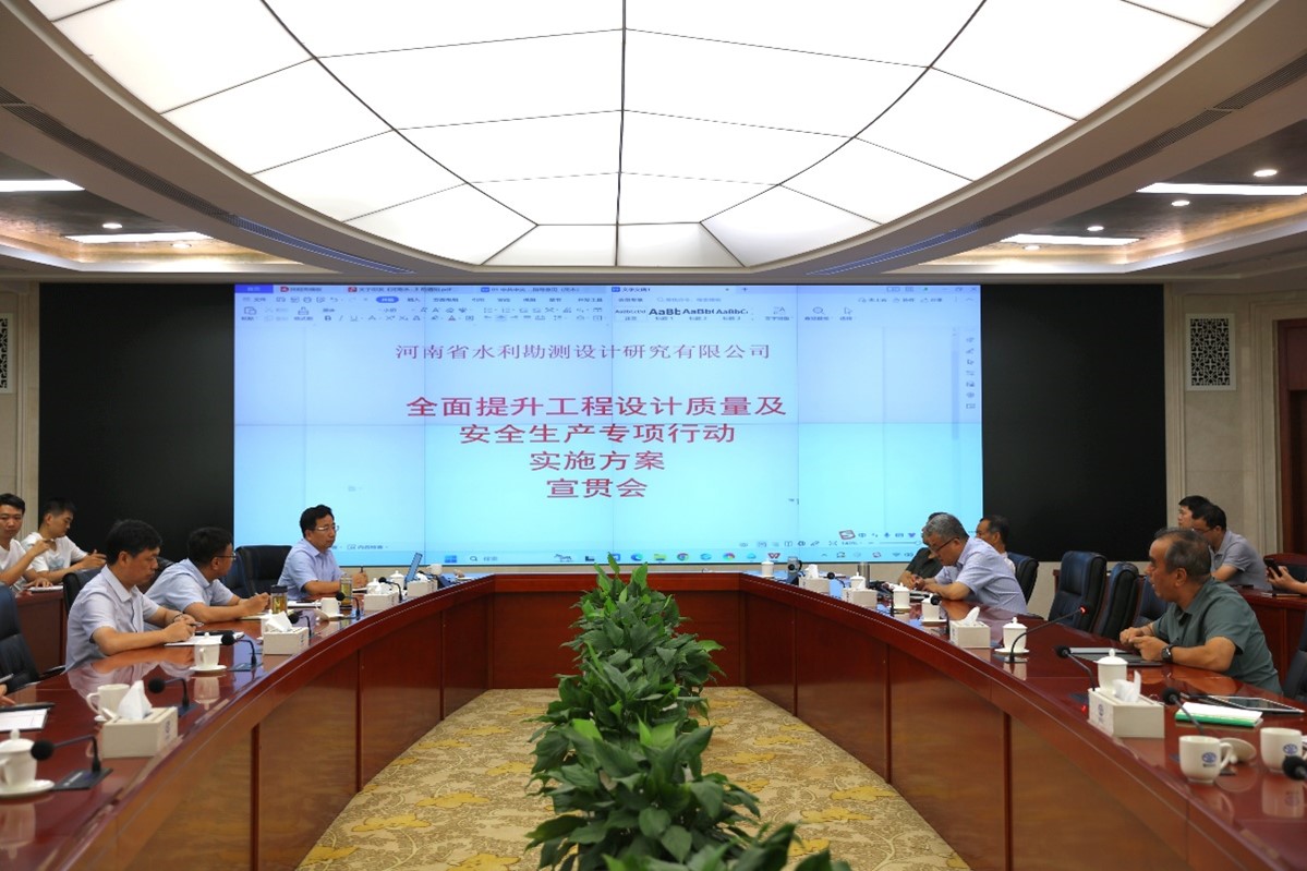 為貫徹落實(shí)《河南水利投資集團(tuán)有限公司全面提升工程建設(shè)管理水平專項(xiàng)行動(dòng)實(shí)施方案》(豫水投〔2023〕151 號(hào))精神,結(jié)合《水利部辦公廳關(guān)于印發(fā)2023年度水利工程建設(shè)質(zhì)量提升工作方案的通知》(辦建設(shè)〔2023〕94號(hào))、水利部《水利建設(shè)項(xiàng)目稽察工作指導(dǎo)手冊(cè)》(2023年版)和省委省政府、省水利廳有關(guān)部署要求,全面提升工程設(shè)計(jì)質(zhì)量和安全生產(chǎn)管理,2023年7月25日下午,公司在二樓會(huì)商中心特舉辦“全面提升工程設(shè)計(jì)質(zhì)量及安全生產(chǎn)專項(xiàng)行動(dòng)實(shí)施方案”宣貫會(huì),會(huì)議由總經(jīng)理朱太山主持,技術(shù)總監(jiān)楊華軍進(jìn)行宣貫。公司副總經(jīng)理賈少燕、趙廷華、監(jiān)事會(huì)主席閆汝華、公司技術(shù)副總監(jiān)、各生產(chǎn)部門班子成員及各項(xiàng)目設(shè)總共100余人參會(huì)。
