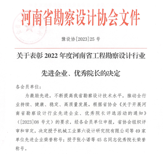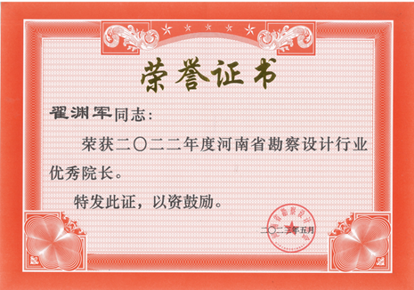 近日,河南省勘察設(shè)計(jì)協(xié)會發(fā)布《關(guān)于表彰2022年度河南省工程勘察設(shè)計(jì)行業(yè)先進(jìn)企業(yè)、優(yōu)秀院長的決定》,公司榮獲“2022年度河南省勘察設(shè)計(jì)行業(yè)先進(jìn)企業(yè)”稱號,公司董事長翟淵軍同志被評為“2022年度河南省勘察設(shè)計(jì)行業(yè)優(yōu)秀院長”。