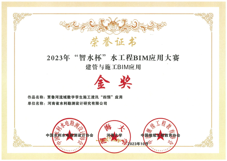 近日,2023年“智水杯”水工程BIM應(yīng)用大賽獲獎項目公示。豫水設(shè)計公司申報項目《賈魯河流域數(shù)字孿生施工度汛“四預(yù)”應(yīng)用》獲建管與施工BIM應(yīng)用金獎;《水工程智慧建造+數(shù)字化運維關(guān)鍵場景數(shù)字孿生應(yīng)用》獲全生命期BIM應(yīng)用銀獎。