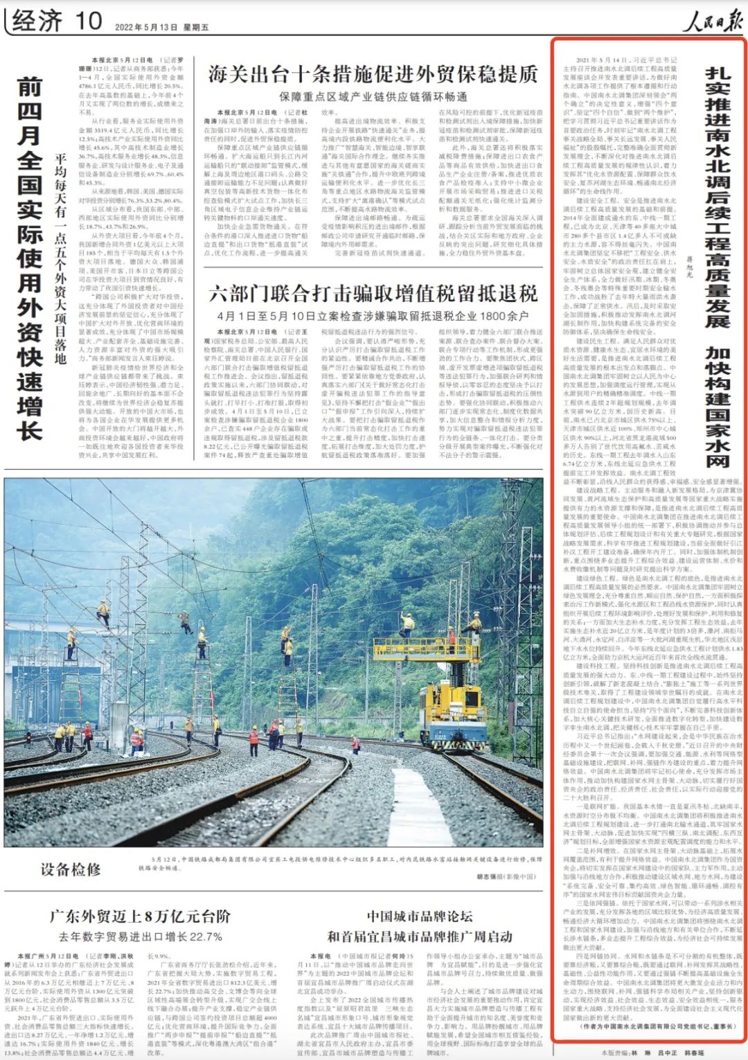 5月13日,在習近平總書記發(fā)表“5·14”重要講話一周年之際,《人民日報》刊發(fā)中國南水北調(diào)集團有限公司黨組書記、董事長蔣旭光署名文章《扎實推進南水北調(diào)后續(xù)工程高質(zhì)量發(fā)展 加快構(gòu)建國家水網(wǎng)》。