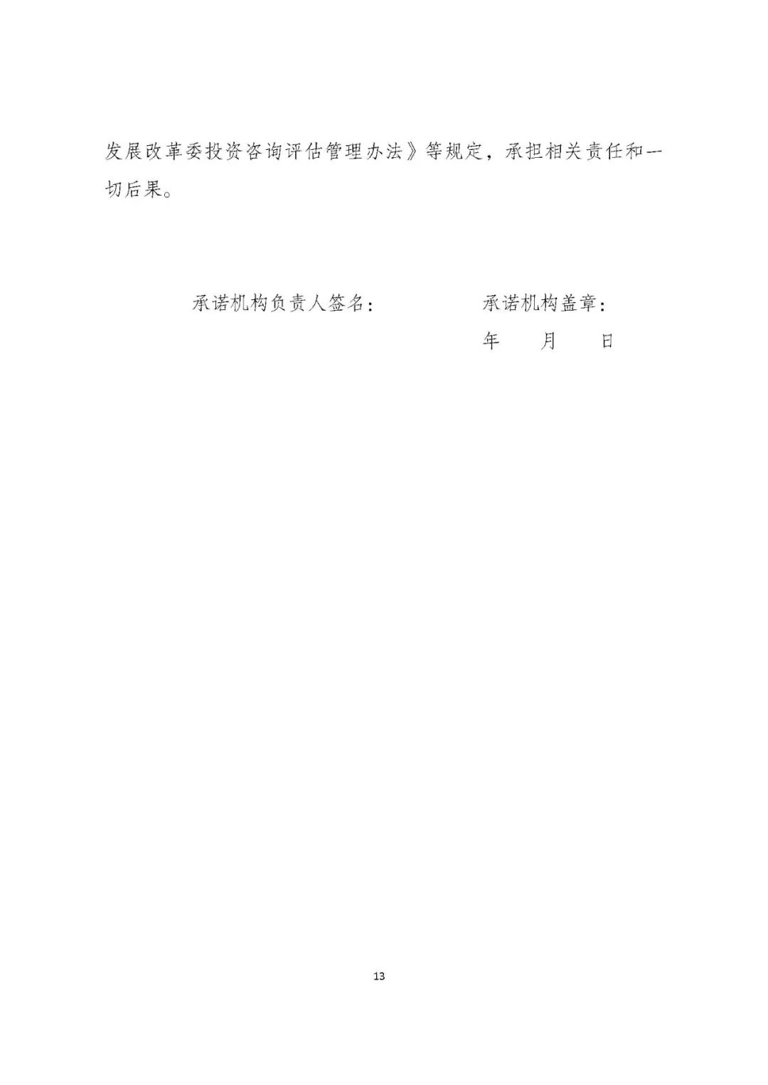 第十八條咨詢?cè)u(píng)估機(jī)構(gòu)、參與咨詢?cè)u(píng)估相關(guān)工作人員應(yīng)當(dāng)按照規(guī)定格式簽訂承諾書,并報(bào)投資司存檔備查。咨詢?cè)u(píng)估機(jī)構(gòu)的承諾書由其法定代表人簽署、咨詢?cè)u(píng)估機(jī)構(gòu)蓋章,參與咨詢?cè)u(píng)估的相關(guān)工作人員承諾書由本人親筆簽署。
