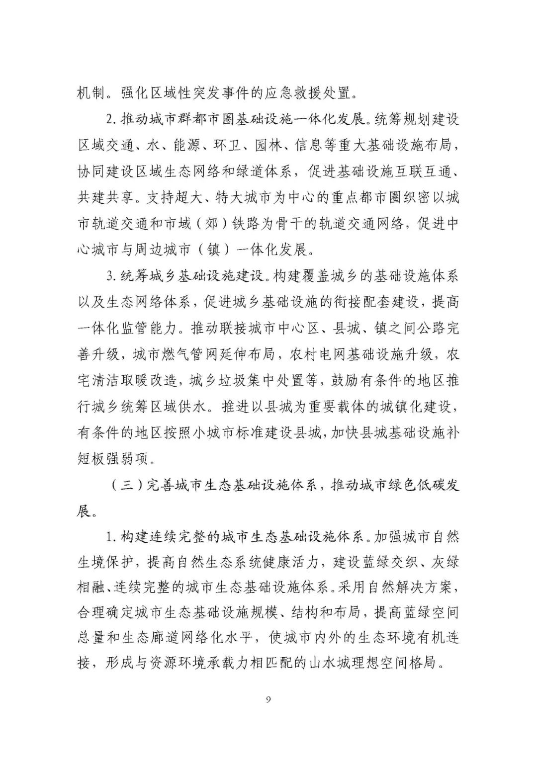《規(guī)劃》圍繞構(gòu)建系統(tǒng)完備、高效實(shí)用、智能綠色、安全可靠的現(xiàn)代化基礎(chǔ)設(shè)施體系,提出4方面重點(diǎn)任務(wù)。一是推進(jìn)城市基礎(chǔ)設(shè)施體系化建設(shè),增強(qiáng)城市安全韌性能力;二是推動(dòng)城市基礎(chǔ)設(shè)施共建共享,促進(jìn)形成區(qū)域與城鄉(xiāng)協(xié)調(diào)發(fā)展新格局;三是完善城市生態(tài)基礎(chǔ)設(shè)施體系,推動(dòng)城市綠色低碳發(fā)展;四是加快新型城市基礎(chǔ)設(shè)施建設(shè),推進(jìn)城市智慧化轉(zhuǎn)型發(fā)展。